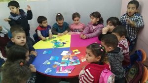 صور اطفال صف المعلمة ايمان حوتري في روضة الامل النموذجية ، اثناء حصة تركيب الأشكال والتعرف على الحيوانات وقطع الأثاث .