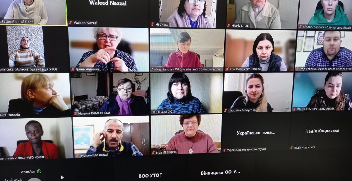 لقاء مع الاتحاد العالمي للصم والاتحاد الاوكراني للصم مع الاتحاد الفلسطيني للصم وشارك في اللقاء السيد محمد نزال رئيس الاتحاد والسيد فراس سلمان نائب رئيس الاتحاد..