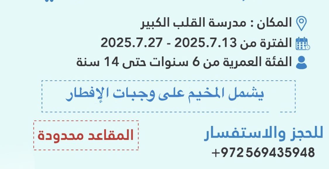 يستهدف المخيم الأطفال من عمر 6 إلى 14 عاماً، ويستمر لمدة أسبوعين، ويتضمن زوايا وأنشطة متنوعة أبرزها الدبكة والفقرات الثقافية، ويهدف إلى الدمج والتوعية الوطنية ضمن أجواء تربوية وترفيهية