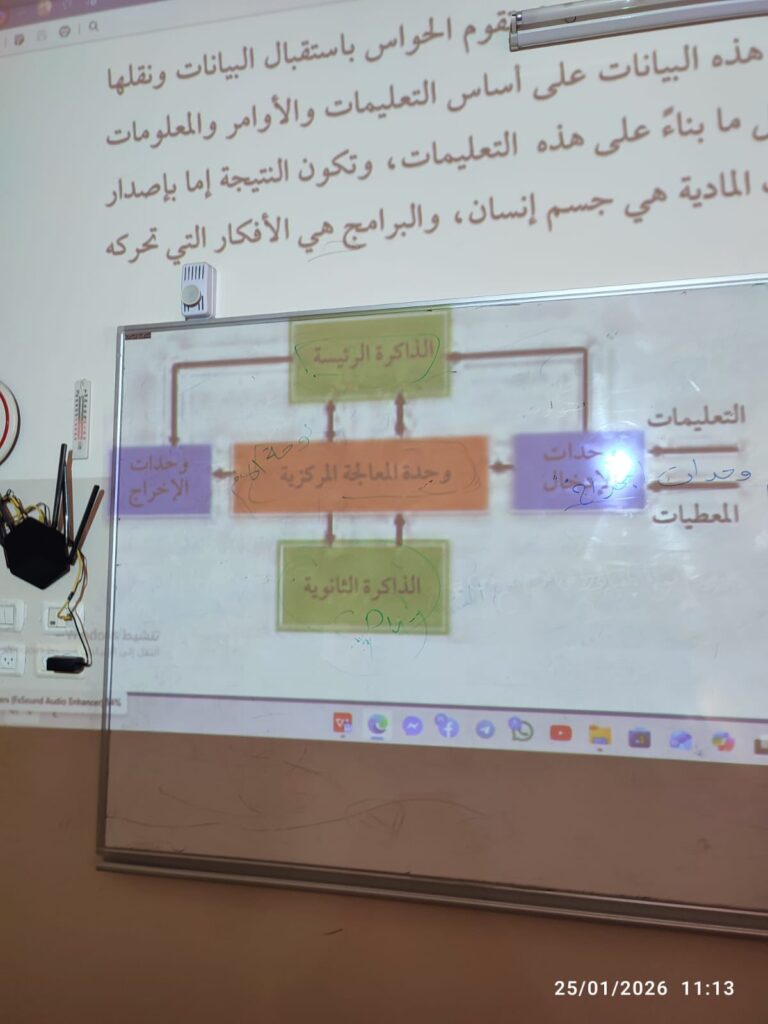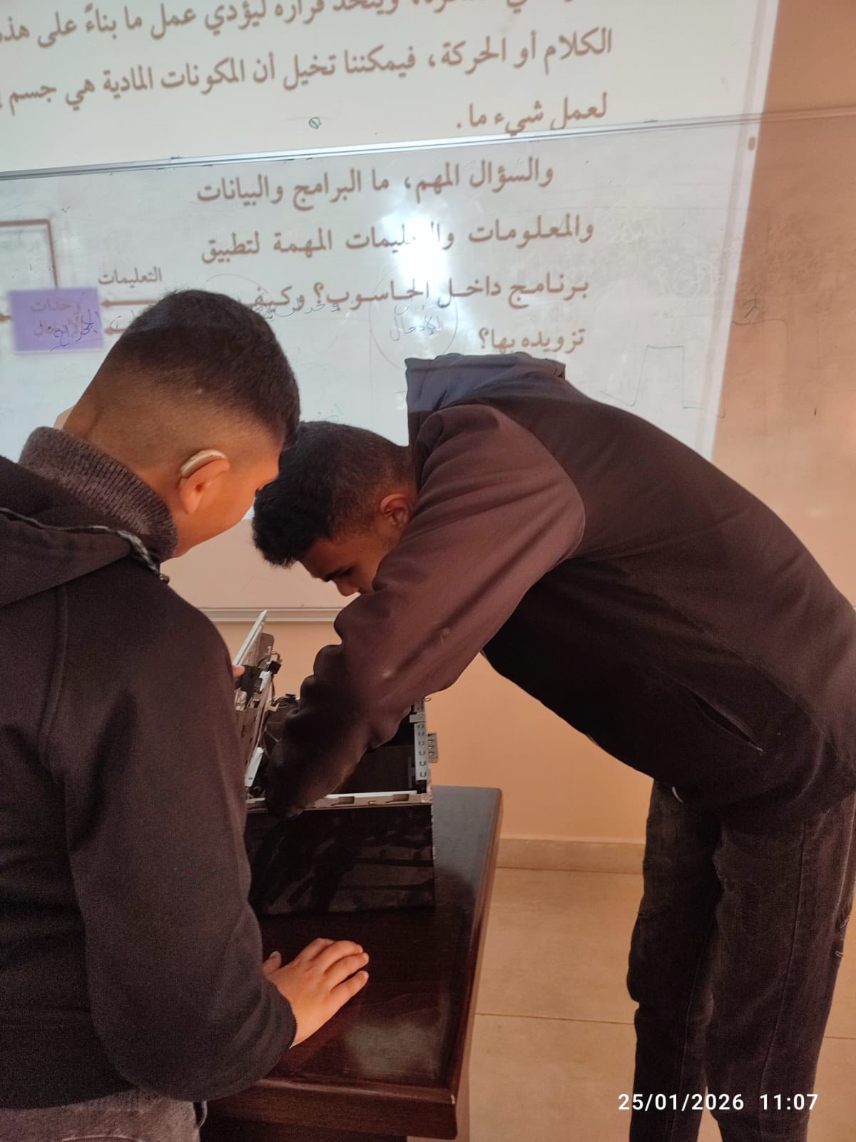 ضمن الأنشطة التعليمية الهادفة، تم تنفيذ درس تفاعلي يحاكي طريقة عمل عقل الإنسان وآلية عمل الحاسوب، حيث تعرّف الطلاب على وحدات الإدخال والإخراج والمعالجة، وكيفية تفاعلها معًا لإنجاز المهام المختلفة.